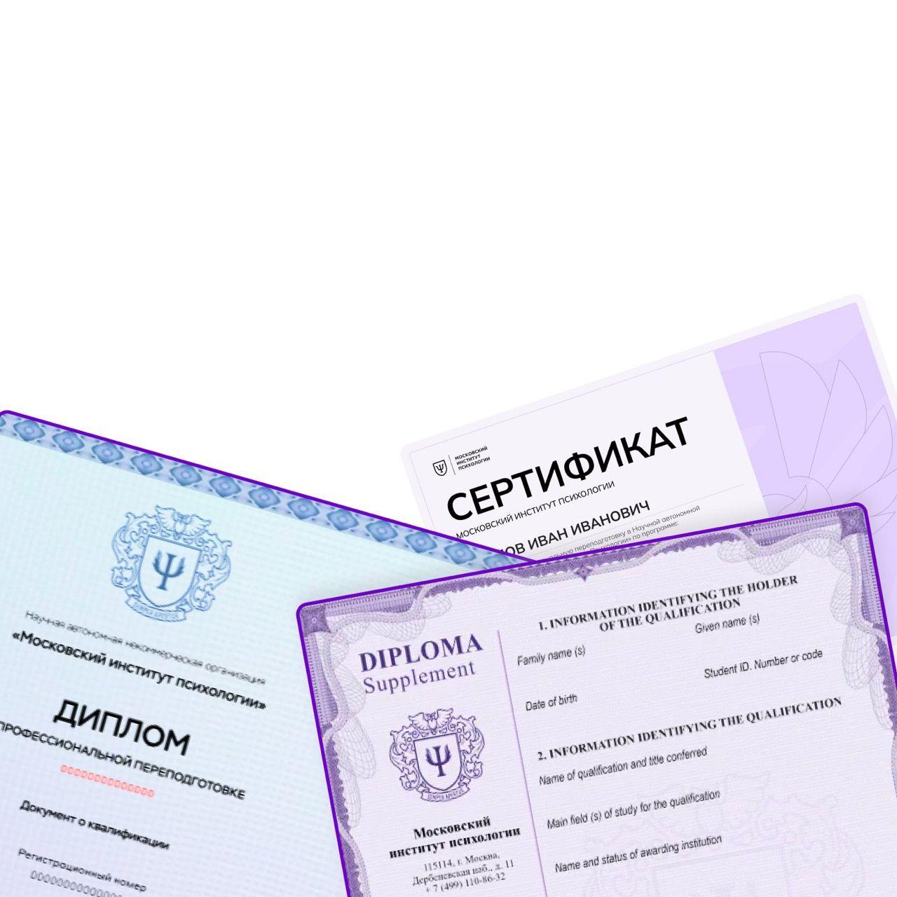После прохождения курсов выдается диплом о профессиональной переподготовке или удостоверение о повышении квалификации установленного образца. Это официальный документ, который вносится в реестр ФРДО. Его можно проверить на сайте Рособрнадзора.В дополнении также выдается диплом или сертификат Московского института психологии в формате А4 для личного портфолио.