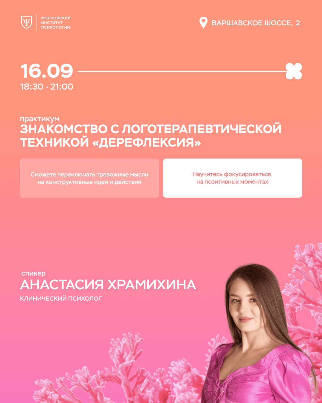 Чувствуете, что застряли в мыслях, переживаниях или бесконечном самоанализе? Логотерапевтическая техника «Дерефлексия» помогает переключить внимание с тревожных и навязчивых мыслей на ценности, смыслы и радости, которые ждут нас в реальной жизни. На этом мастер-классе вы узнаете, как перестать быть заложником внутреннего «монолога» и начать жить проще, свободнее и радостнее. Вас ждёт теория, живые примеры и интерактивная практика, которая останется с вами надолго.